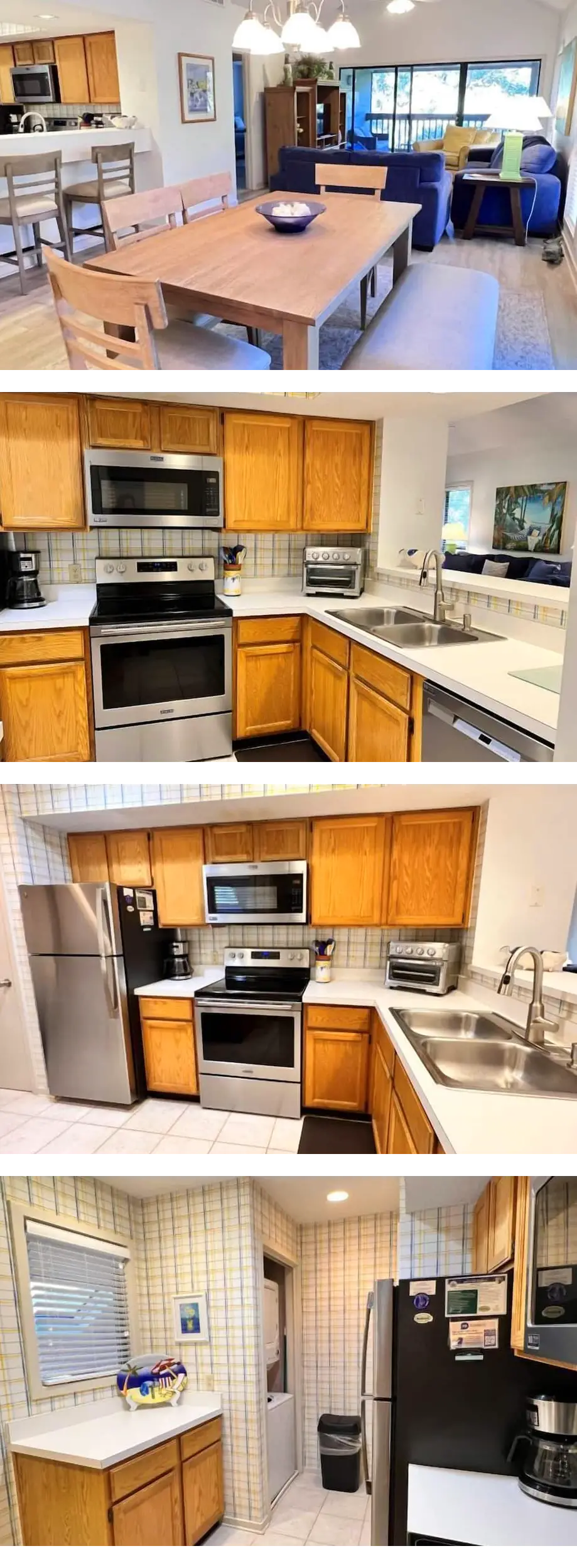 This villa opens into a completely equipped kitchen with bar seating for 2. The kitchen overlooks the dining room, which has a table with 4 chairs and a bench seat, comfortably seating 6. The dining area flows into the roomy living room that has tons of natural light.